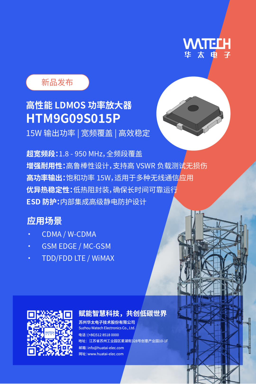 華太電子全新推出的 HTM9GO9S015P 和 H9G3438M15P 兩款 LDMOS 放大器,分別覆蓋 1.8 - 950 MHz 和 3.4 - 3.8 GHz 的頻段,均提供 15W 的輸出功率。這兩款產品憑借其高效、穩(wěn)定的性能,為 5G 和無線通信應用提供了強大的技術支持。
